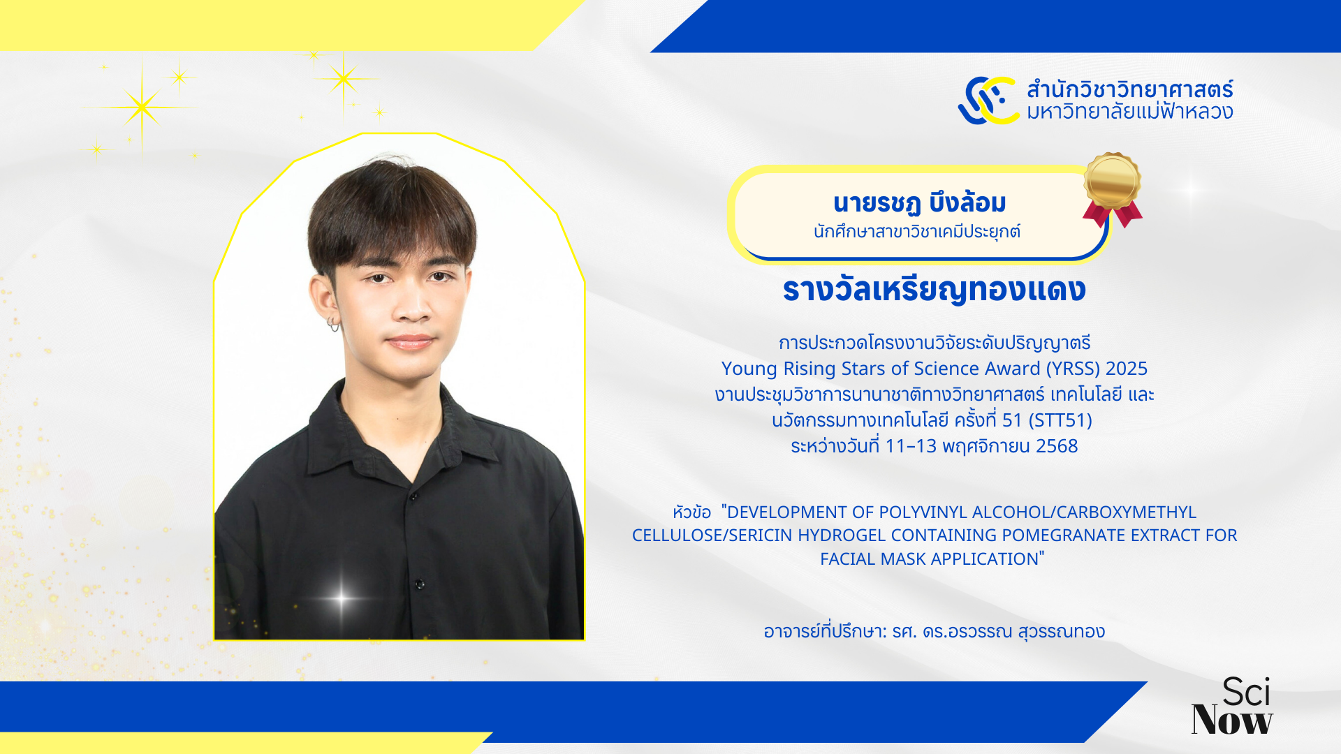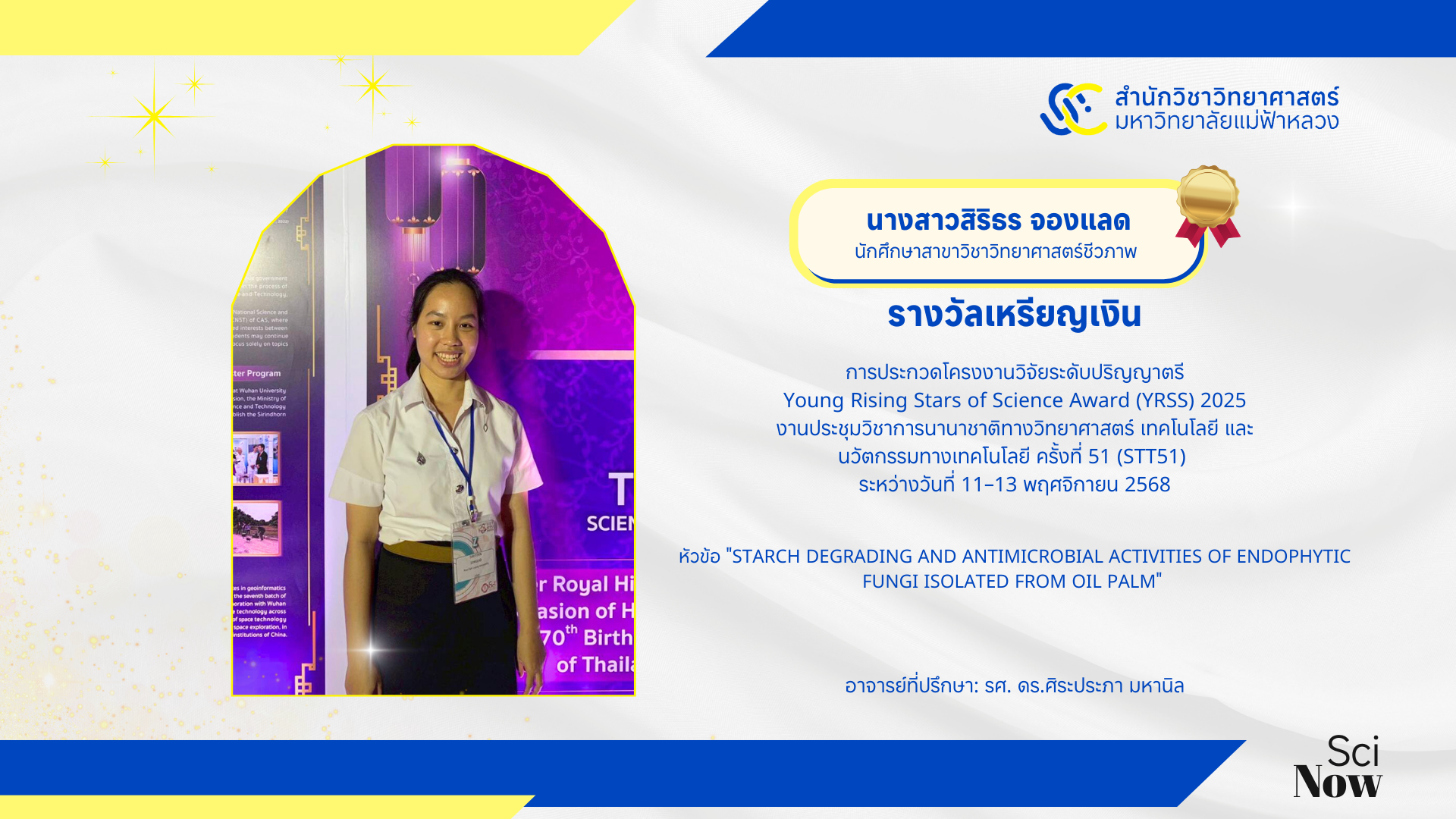 สำนักวิชาวิทยาศาสตร์ มหาวิทยาลัยแม่ฟ้าหลวง ขอแสดงความยินดีอย่างยิ่งกับตัวแทนนักศึกษาคนเก่ง ที่ได้สร้างชื่อเสียงและความภาคภูมิใจให้กับสำนักวิชา ในการประกวดโครงงานวิจัยระดับปริญญาตรี "Young Rising Stars of Science Award (YRSS) 2025"