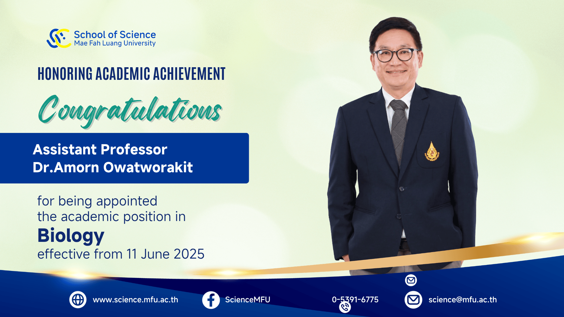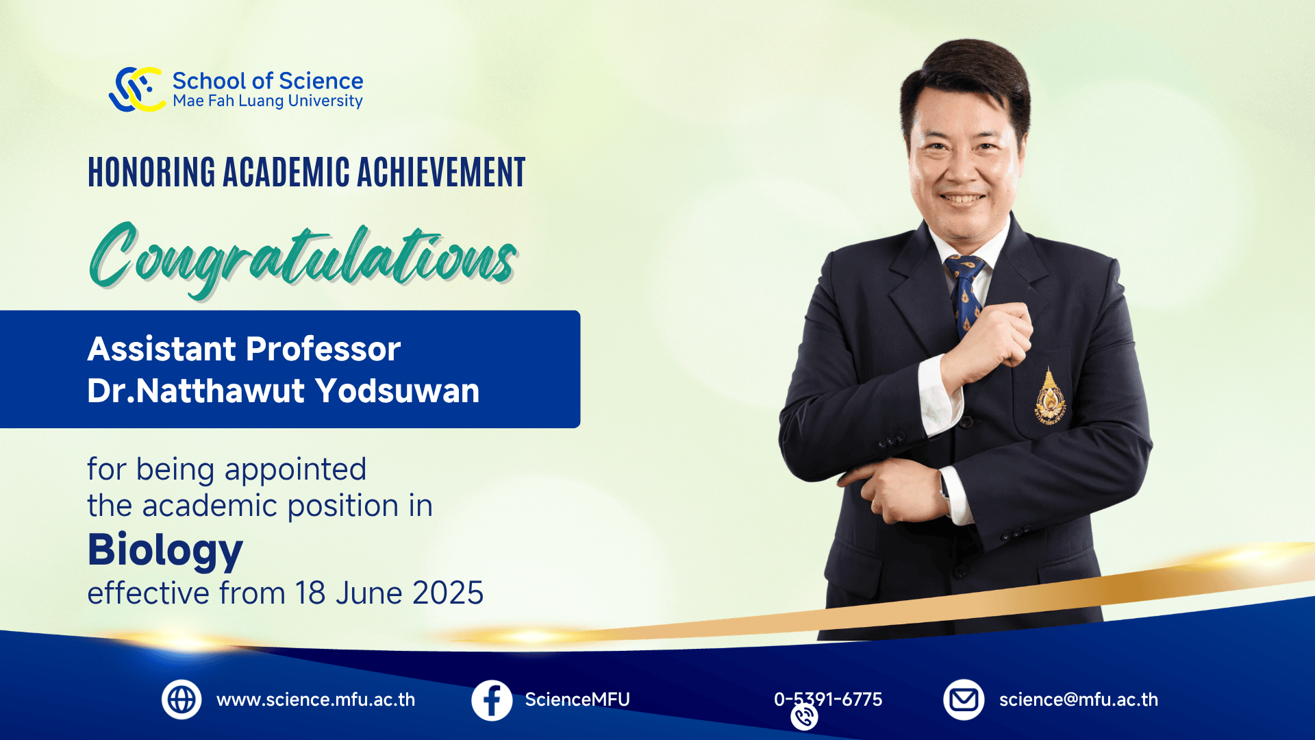 สำนักวิชาวิทยาศาสตร์ขอแสดงความยินดีต่อคณาจารย์ที่ได้รับแต่งตั้งให้ดำรงตำแหน่งทางวิชาการ อันเป็นผลจากความทุ่มเทในการสร้างสรรค์ผลงานทางวิชาการอย่างต่อเนื่อง