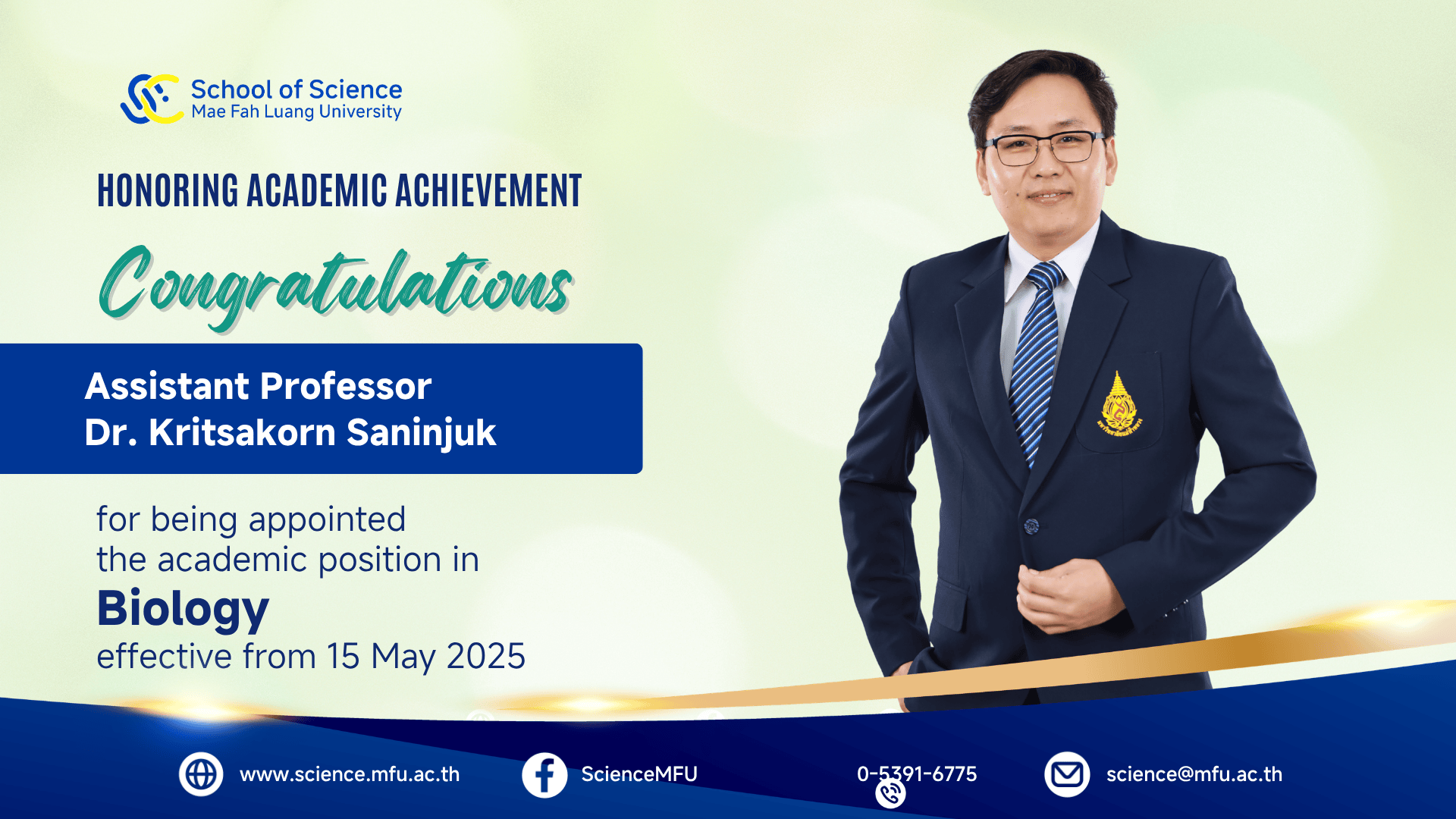 สำนักวิชาวิทยาศาสตร์ขอแสดงความยินดีต่อคณาจารย์ที่ได้รับแต่งตั้งให้ดำรงตำแหน่งทางวิชาการ ระดับผู้ช่วยศาสตราจารย์