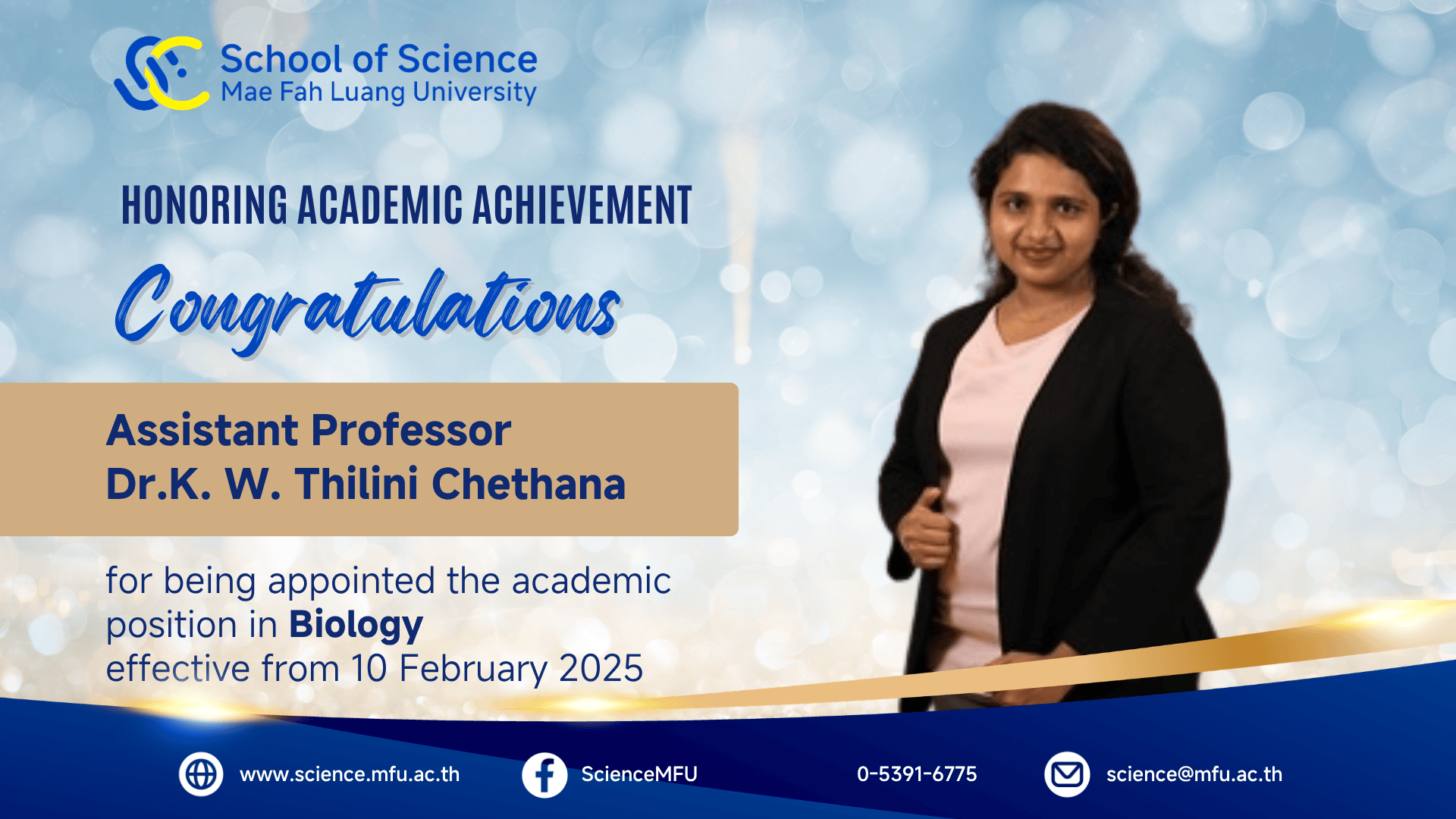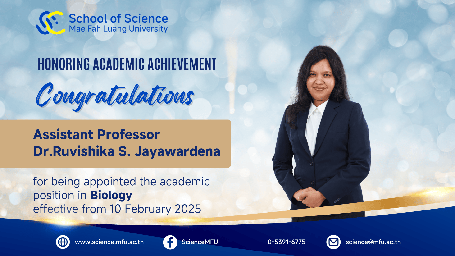 สำนักวิชาวิทยาศาสตร์ขอแสดงความยินดีต่อคณาจารย์ที่ได้รับแต่งตั้งให้ดำรงตำแหน่งทางวิชาการ อันเป็นผลจากความทุ่มเทในการสร้างสรรค์ผลงานทางวิชาการอย่างต่อเนื่อง